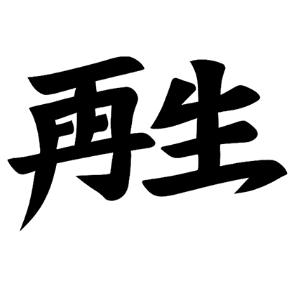 Japanese kanji “Rebirth” (再生) embroidered on the chest.